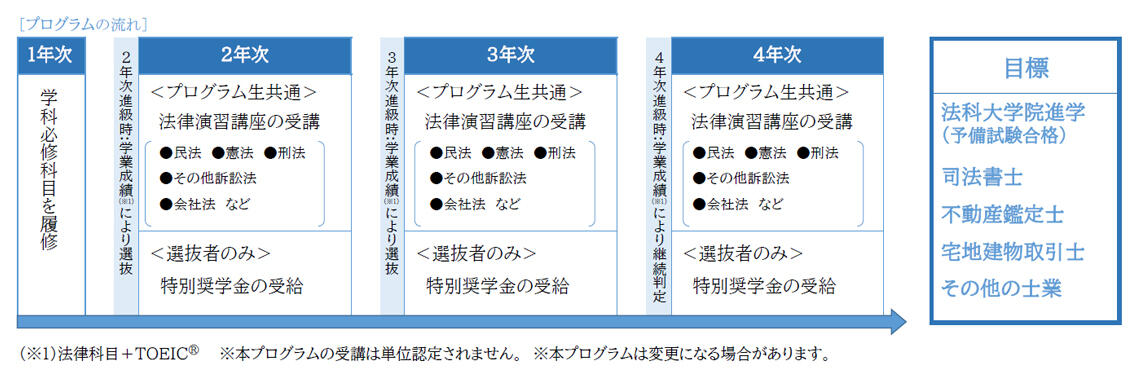 | 内容 | ①法科大学院進学および法律の国家資格取得に対応するプログラム講義実施 ②プログラム特別奨学生への奨学金授与 |