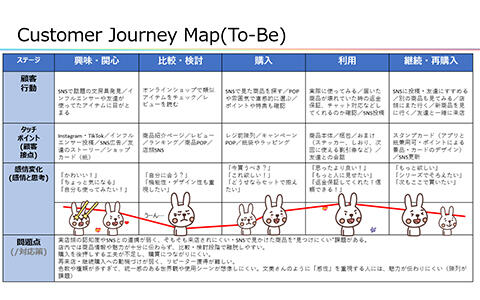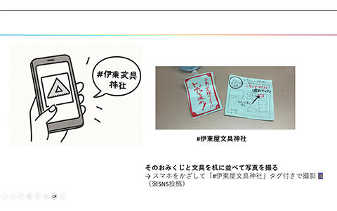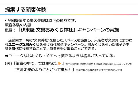 本授業では、新しい「買い物体験」を設計し、伊東屋横浜元町店へ提案する課題に取り組みました。課題に取り組むにあたって、実際の伊東屋さんのデータをいただき、それを用いて分析・考察を行いました。最終的な成果物としては、①新しい買い物体験のビデオプロトタイプ ②提案に至った考えを説明する資料(パワーポイント)を完成させました。