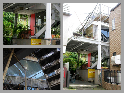 ■所在地…吉祥寺本町4丁目 ■構造…鉄管+鉄骨造 ■規模…2F(半地下) ■用途…住宅+オフィス 鉄管と鉄骨で構成された白いフレームが建物の外殻を構成している。壁らしい壁が見えない点が特徴で、大きなガラス窓や宙に浮くテラスなど、内部は明るく開放的だ。全体的に白で統一されたシンプルさの中にも、力強さが感じられる建物。この力強く白いフレームの中に赤い入り口扉が印象的に用いられている。(伊藤)