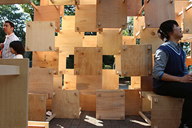 ラワン合板と米松の棒材を用い、細い棒材と薄い面材によ り構成される400mm×400mmの立方体キューブを基本モジュールとした、高さ約4m、全長約8m程のひとつの丘のような集積体を形成している。中を歩くことで板の壁と棒材の隙間から向こうの景色が見え隠れする、という背反する2つの空間が体感でき、角度によって先の見える風景が変化する空間シークエンスが特徴的である。学園祭のインターフェイスの場をつくるとともにベンチやテーブル状の構成要素が憩いの場としても機能し、会場の賑わいを演出した。