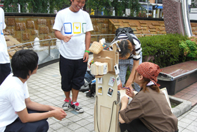 | ■参加deデザイン 指導教員:水谷俊博 □環境論演習1 『「幸せのイヌ」 - 人々の幸せへのメッセージをカタチに - 』 9月4日(土)、5日(日)多摩六都科学館において、アートワークショップ展「『幸せのイヌ - 人々の幸せへのメッセージをカタチに - 』」を開催。8/15〜8/28の期間に、都内の浅草、銀座、秋葉原、新橋、吉祥寺、田無の各地で、採集したまちの人々の「幸せへのメッセージ」をポラロイド写真のインスタレーションとして展示。アートワークショップのために制作したオリジナルデザインの動物型の木製モバイルとともに、ワークショップの経過資料の展示もおこなった。 開催:2010.9.4 - 9.5 場所:多摩六都科学館(東京都西東京市) |