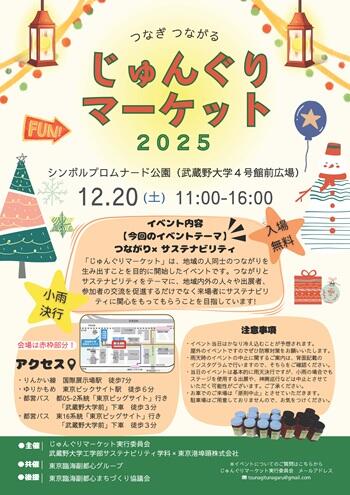 | 問合せ | じゅんぐりマーケット実行委員会 E-mail:tsunagitunagaru@gmail.com ※イベントに関する問い合わせのみ。取材に関する問い合わせは広報課宛(kouhou@musashino-u.ac.jp)にお願いします |