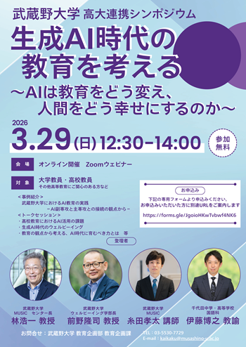 | 内容 | <事例紹介> 武蔵野大学におけるAI教育の実践-AI副専攻と主専攻との接続の観点から- <トークセッション> ・高校教育におけるAI活用の課題 ・生成AI時代のウェルビーイング ・教育の観点から考える、AI時代に育むべき力とは 等 |
