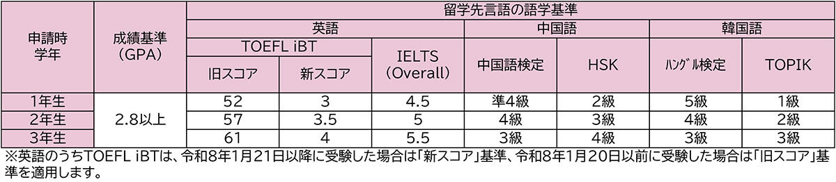 - 留学先プログラムの主要言語の語学能力が、以下のいずれかの基準を満たすこと