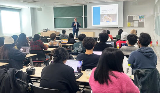 グローバルビジネス学科では、すべての授業が英語で行われる特徴を活かして、海外からの大学教員や実務家をゲストに招き、不定期に特別講義を開催しています(令和5年度は合計6回開催)。学生たちも普段の授業とは違う雰囲気の中でビジネスを学べるため、楽しみなイベントとなっています。