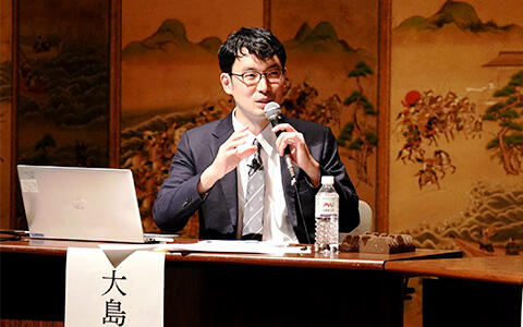 講演では、川村 裕子文学部客員教授が「大河ドラマ『光る君へ』の表現分析」と題し、非言語表現「シャレード(影)」の分析を通じて登場人物の関係性や心理の変化を読み解きました。続いて、大島 武宙文学部専任講師が「『万葉集』の研究と創作‐折口信夫を例に」と題し、折口 信夫の研究と創作の関係を紹介し、「研究と創作を行き来することで独自の表現が生まれる」と語りました。