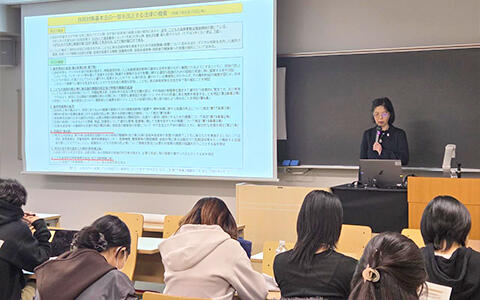 12月12日、法学部政治学科の渡辺 恵子教授が担当する「公共政策論2」の授業で、こども家庭庁長官官房審議官(支援局担当)の源河 真規子氏をお招きし、「政策について考えてみよう」と題して、こども家庭庁が行う若者支援とこどもの自殺対策についてご講義いただきました。