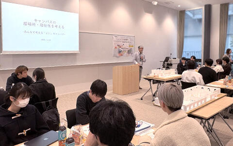 12月3日、有明キャンパスで「キャンパスの居住性向上ワークショップ」を開催しました。当日は、学生部長であり工学部建築デザイン学科所属の伊藤 泰彦教授、多文化共生や特別支援学校の支援などに取り組む、グローバル学部日本語コミュニケーション学科の神吉 宇一教授、留学生の職場適応や学習環境デザインなどの研究に取り組む、同学部グローバルコミュニケーション学科の島田 徳子教授のほか、公募で集まった学生20名、伊藤研究室の学生6名が参加し、全6グループに分かれてキャンパス環境改善に関する意見交換を行いました。