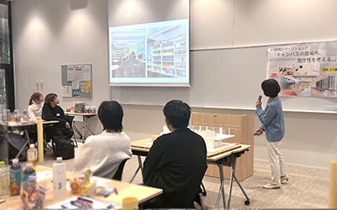 ワークショップは、参加学生の自己紹介から始まり、その後、神吉教授による内容の説明と伊藤教授、島田教授よる他大学の施設事例の紹介がありました。学生たちはそれらを踏まえ、「キャンパスにあれば便利・快適な施設」をテーマに、アイデアを付箋に書き出し、発表しました。