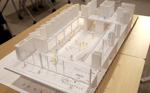 続いて、有明キャンパスの図面(1号館2階、5号館1階学生ホール)に付箋を貼りながら、具体的な改善案を検討しました。アイデア出しには伊藤研究室の学生が制作したキャンパス模型も活用し、「屋上で運動できるスペース」や「キャンパス内の移動を便利にする移動手段の整備」「くつを脱いでくつろげる癒し空間」「オンライン受講のための個室スペース」など、多彩なアイデアが次々に出され、空間改善への強い関心が伺えました。
