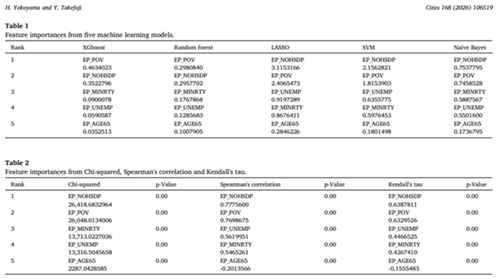 データサイエンス学部データサイエンス学科3年生 横山 広樹さんの論文が、国際的な学術誌「Cities」第186巻に掲載されました。本研究は、アメリカにおける地域の社会的脆弱性(SVI)に影響を与える要因について、AI(機械学習)と統計的手法の両面から分析・比較を行ったものです。