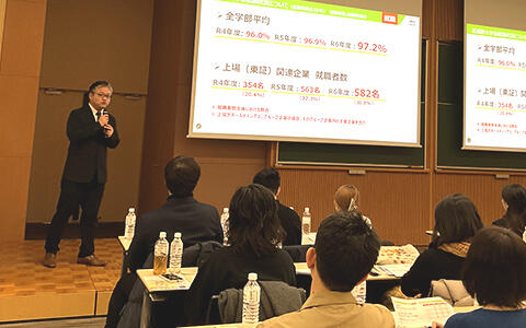 説明会の前半では、本学のキャリア科目「キャリアデザインA」を担当する株式会社Strobolights代表取締役社長の羽田 啓一郎氏が登壇し、データを交えて最新の新卒就活を解説しました。続いて、本学キャリア部長およびキャリアセンター支援課長より、1年生から段階的に実施している本学独自の就職・キャリア支援の詳細と、最新の就職実績について報告を行いました。