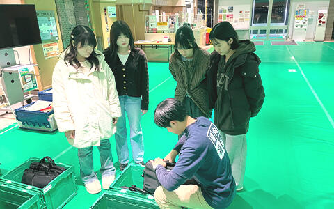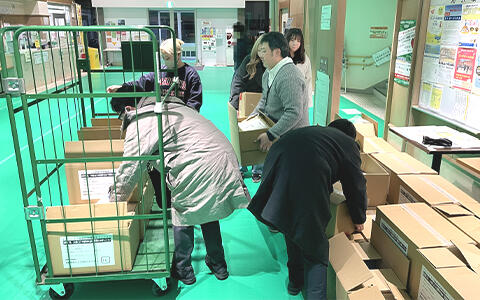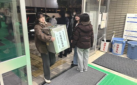 選挙事務体験は、江東区選挙管理委員会が開票所を設置した深川スポーツセンターにて行われました。参加学生は開票開始の約1時間前に集合し、区職員の指示のもと、約2時間半にわたり補助業務を担当しました。具体的には、班に分かれてタクシーで運ばれてきた投票箱や関連物品を運搬する業務や、投票用紙を取り出して空になった投票箱を片づける業務、備品整理などを行いました。