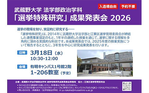 また、2025年度「選挙特殊研究」の成果発表会を3月18日に、武蔵野大学有明キャンパスで開催します。当日は、2025年度の授業実施について報告するとともに、第10期生(3年生)を中心に研究成果の発表を行います。詳細は本ページ下部をご確認ください。