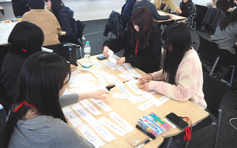 当日は、事前学習の内容をゲーム形式で振り返るグループワークからスタートしました。短冊に記載された選択肢を2つ組み合わせて回答を導く形式で、「なんだっけ?」「難しいな」という声が飛び交い、5分という短時間での挑戦に苦戦する様子が見受けられました。