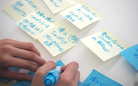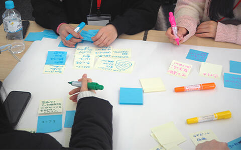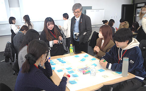 その後、「カーボンニュートラルな未来の大学を考えよう!」というテーマの下、グループワークが行われました。まずは各自の考える理想の大学を付箋に書き出しました。温泉や足湯、休憩所、おいしい学食が欲しいなど個人の欲望を満たす案があがるなか、白井教授より「カーボンニュートラルとは温室効果ガスの排出量を、実質的にゼロにすることを指している」という説明が加えられ、軌道修正が行われました。また、進行を担ったサステナビリティ学科の学生が各テーブルを回り、個人のアイディアと環境問題との関連付けをサポートするアドバイスを行っていきました。