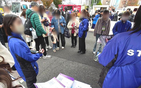 実施日は11月23日。来場者5,690人に向けてチラシを配布し、アンケートやSNSでの発信も行いました。当日、会場の設備の関係で「ポスター掲示が難しい」という想定外の事態が発生しましたが、ポスターを手に持ち、ハーフタイムや屋台に並ぶ来場者一人ひとりに声をかけ、直接対話を重ねていきました。