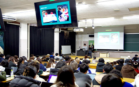 - A 毎年、年度末の全体報告会では各クラスの代表チーム(各クラスで一番アクションの質やインパクトが高かった取組が1組選考される)の発表がありますが、どの取組にも魅力や意義があり、43チームすべてのプレゼンテーションを聴くことが出来ないことが悔やまれます。今年の全体報告会では、後期という限られた時間のアクションでしたが、その中でもやってみて、うまくいかなければ、修正して再度チャレンジするというサイクルを回して、アクションを形にした取組が複数エントリーしていたことが印象的でした。また、今年は入学予定者の方へも報告会を公開しました。入学前に授業の雰囲気を肌で感じながら、先輩と懇談する機会にもなり、良い場を設けることが出来たと思います。