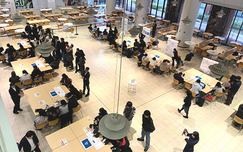 今春に進学・就職予定のグローバルコミュニケーション学科の4年生10名が、就職活動の軸として重視したこと、取り組んだこと、就職活動中の挫折を力に変えたエピソード等を交えながら、ポスター形式で発表しました。3年生は各ブースを巡り、メモを取り、質問をしながら、熱心に先輩の経験に耳を傾けました。