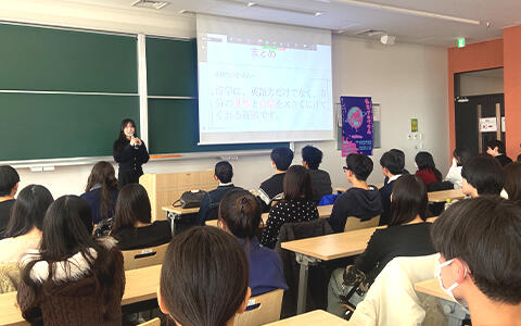 前半はグローバルコミュニケーション学科の教員のほか、4名の学生が登壇し、学科の学びや留学経験について、先輩だからこそ伝えられるアドバイスを交えながら発表しました。