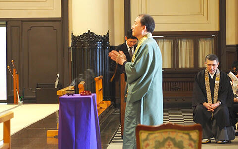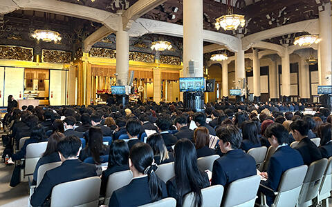 4月9日、10日の2日間にわたり、築地本願寺で新入生と教員を対象とした参拝を行いました。両日にわたって全学部・研究科ごとに計6回に分かれて参拝を行い、参加者は本学発祥の地である築地本願寺で学祖高楠 順次郎博士の建学の理念について理解を深めるとともに、自らの夢や目標に向かって初心を固める日になりました。