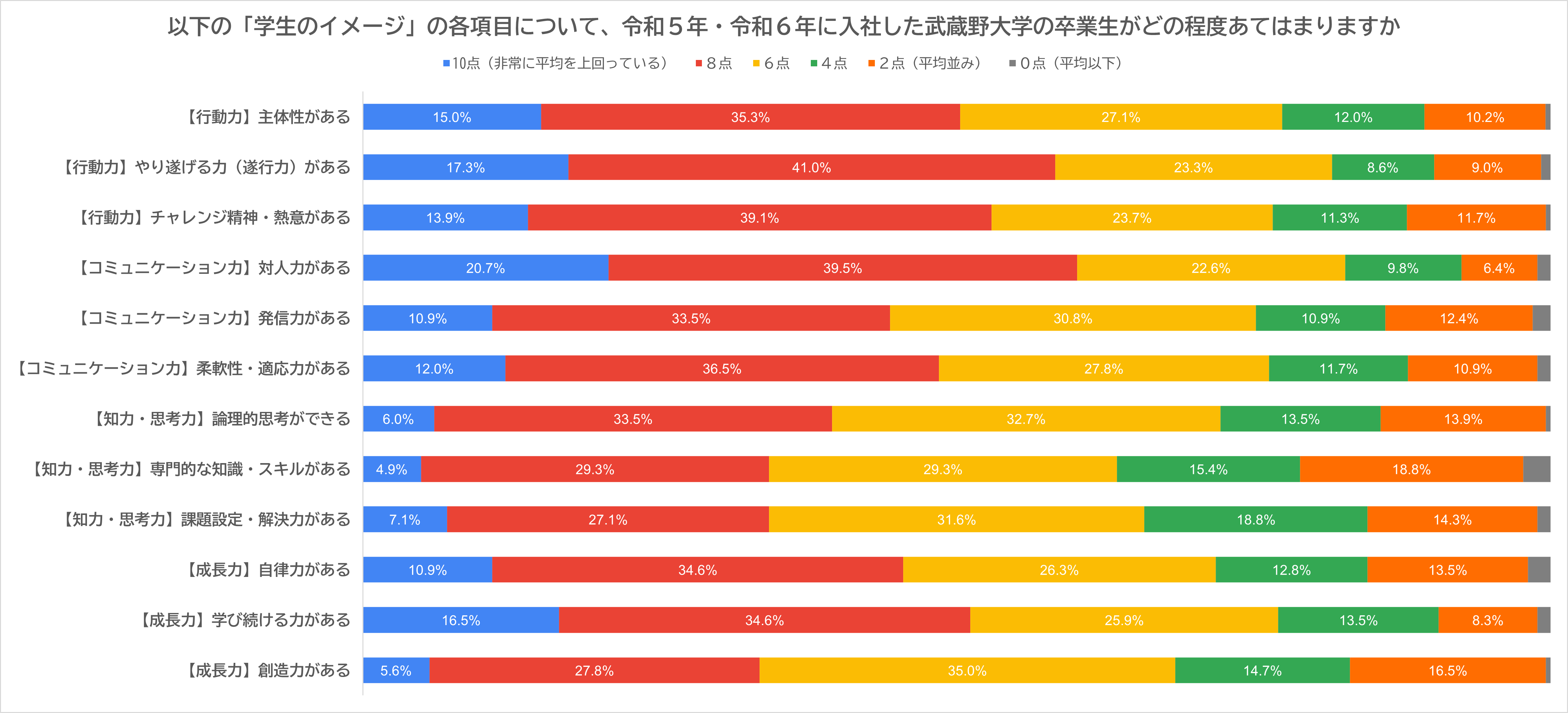 以下の「卒業生の資質・姿勢」の各項目について、令和5年、令和6年に入社した武蔵野大学の卒業生が、どの程度あてはまるか6つの選択肢からお選びください。