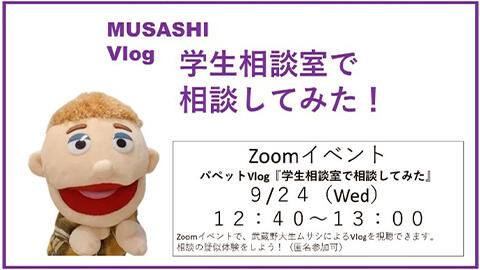 武蔵野大生ムサシのVlogを見て、学生相談室の予約から相談の仕方を疑似体験してもらいました。動画上映中は、Zoomのリアクション機能を使い、参加者の方から沢山の応援をいただきました。ムサシもとても喜んでおりました!「学生相談室って聞いたことはあるけどどんなところ?」「利用したいと思っている」「困った時の為に一応使い方を知っておきたい」など色々な方に学生相談室を知ってもらう機会になっていたら嬉しいです。