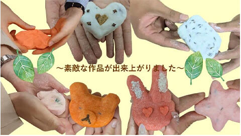 今回は、ラベンダー、オレンジスイート、ハッカ、バニラ、レモングラスの香りを用意しました。石けんをこねる工程はまるで粘土作りのよう!良い香りを楽しみながらこねこね…。子どもの頃に戻って手触りなども楽しんでいただけたと思います。色や飾り付けで、個性豊かな石けんの出来上がり♪ 皆さんのお昼休みが癒しの時間になっていたら嬉しいです。